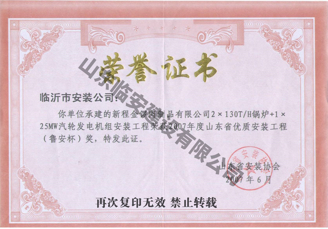 山東臨安建設有限公司(原名臨沂市安裝公司)始建于一九六六年,是由老國企改制的股份制企業,公司總部位于羅莊區通達路211號,現有職工1000余名,各類工程經濟技術人員816名,其中高中級職稱64名,初級職稱204人。主要從事機電工程施工總承包,電力施工總承包,石油化工施工總承包,建筑裝飾裝修施工總承包,鍋爐安裝、改造I級(參數不限),GB1、GB2(2)級、GC1級、GD1級壓力管道安裝,起重機械B級安裝,電力設施承裝、承試,并取得了GB/T19001-2008質量管理體系認證證書、GB/T28001-2011職業健康安全管理體系認證證書、GB/T24001-2004環境管理體系認證證書,資信等級“AAA”級。